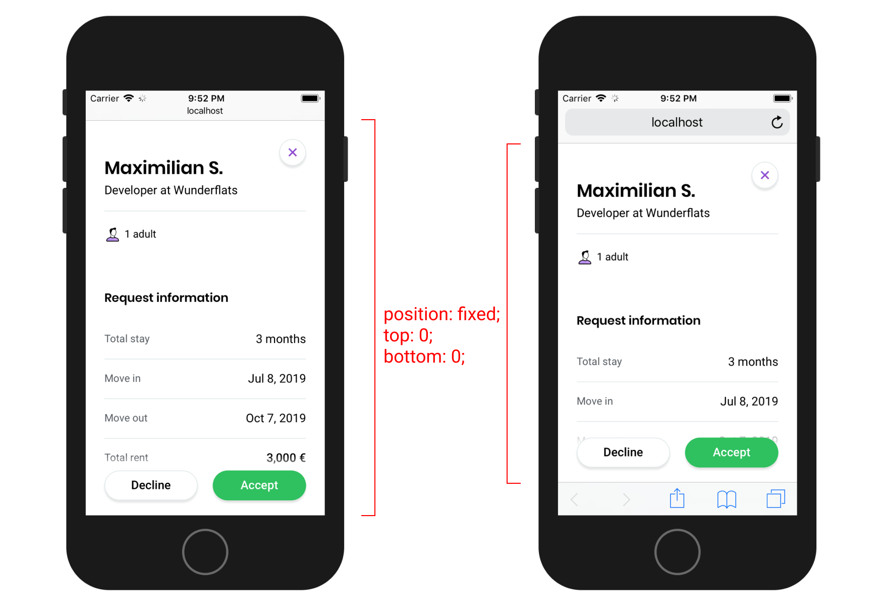 A recent change made it so that the most important buttons in our booking request modals, the buttons to accept or reject a booking request, were not always visible on mobile.